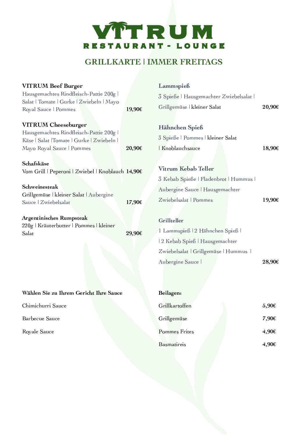 Willkommen zu unserem wöchentlichen Grillabend im Vitrum Restaurant-Lounge! Jeden Freitag verwandeln wir unseren gemütlichen Außen- und Innenbereich in ein Paradies für Grillliebhaber. Erleben Sie saftige Steaks, würzige Würstchen und frische, saisonale Beilagen – alles frisch für Sie zubereitet.